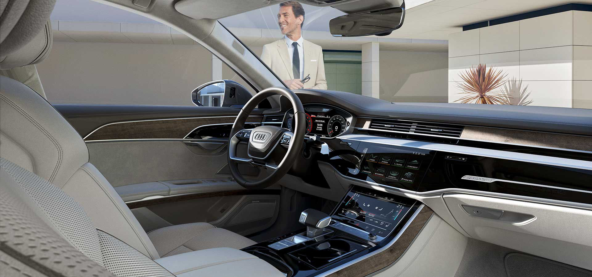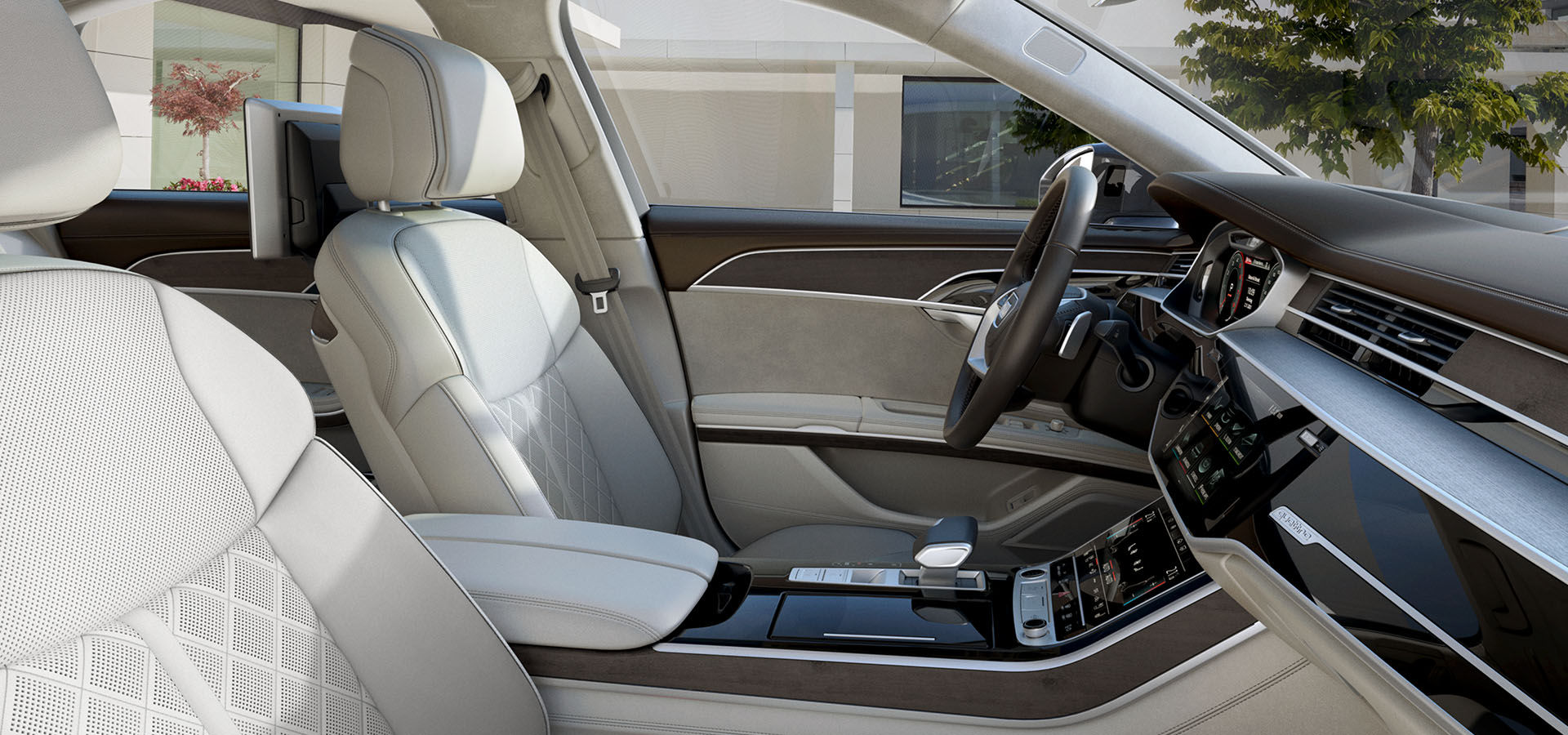 아우디 A8의 인테리어는 최고급 소재와 첨단 기술이 조화를 이루며, 대형 디지털 계기판과 듀얼 터치스크린 MMI 시스템이 적용되어 직관적인 조작이 가능합니다. 최고급 나파 가죽 시트, 우드 및 알루미늄 트림이 사용되어 고급스러운 분위기를 자아냅니다.