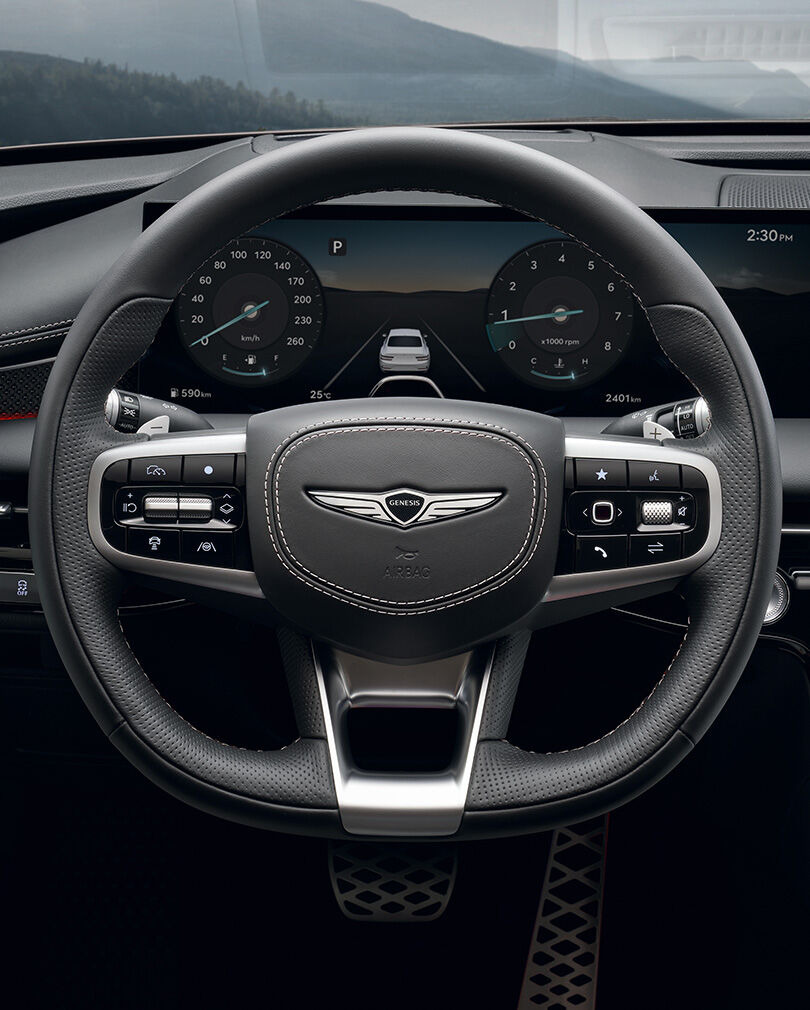 2025 G80의 첫인상은 더욱 정교해진 **크레스트 그릴(Crest Grille)**과 **두 줄 디자인의 쿼드 램프(Quad Lamps)**에서 시작됩니다. 제네시스의 브랜드 아이덴티티가 강조된 얇고 길어진 LED 헤드램프는 미래지향적인 분위기를 연출하며, 공기역학을 고려한 새로운 디자인이 적용되었습니다.