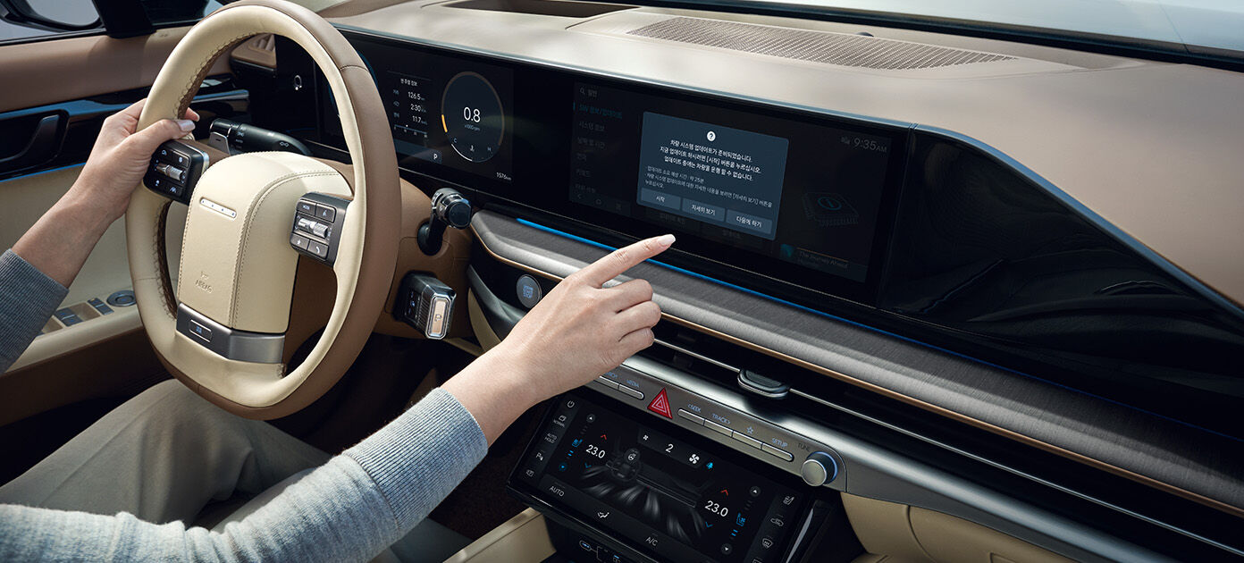 2025 그랜저에는 12.3인치 디지털 계기판과 14.6인치 OLED 센터 디스플레이가 탑재되었습니다. 최신 Connected Car Navigation Cockpit(ccNC) 시스템이 적용되어 더욱 빠른 반응 속도와 직관적인 조작성을 제공합니다.